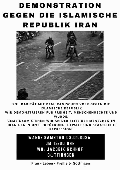 Mitteilung des Iran Solidaritätsvereins: "Aufruf zu Mahnwache in Göttingen Seit Tagen ist die Welt Zeugin beispielloser Demonstrationen in Iran gegen das Mullah-Regime. In Teheran, Isfahan-Shiraz, Kermanscha und Tabriz werden Demonstranten und Demonstrantinnen erschossen, erschlagen, verhaftet und gefoltert. Nach Presseangaben sind viele Tote zu beklagen. Die Demonstranten sind nicht nur zornig über den Wahlbetrug. Sie protestieren vor allem gegen das menschenfeindliche Mullah-Regime. "Tod der Diktatur rufen sie. Wir wollen in Göttingen mit einer Mahnwache und einer Kundgebung vor dem Alten Rathaus uns gegen die brutale Misshandlung und offene Tötung der Demonstranten protestieren. Damit wollen wir unsere Solidarität mit den Menschen in Iran zum Ausdruck bringen."