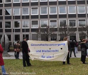 26.1.10: UnterstützerInnen begleiten Familien zur Ausländerbehörde / Korrespondenz-Infos / Am Dienstag den 26.1.10 waren VertreterInnen von 7 Familien bei der Ausländerbehörde vorgeladen. 12 Menschen, die die Familien gegen die Abschiebung unterstützen haben die Leute bei ihrem Gang zur Behörde begleitet. Ansonsten fand der Vorgang unter Ausschluß der Öffentlichkeit und ohne PressevertreterInnen statt. Die Vorladung dauerte insgesamt ca. 1 Stunde. Währenddessen postierten sich vor dem Gebäude zunächst 2 Polizeiwagen später kamen dann noch zwei weitere hinzu. Den vorgeladenen Familienmitglieder wurde folgendes Schiksal verkündet: 3 Familien davon haben eine sogenannte "Duldung" bis Ende April, 3 Familien nur eine Duldung bis Ende Februar. Eine Person hat eine Verlängerung bis 14. März erhalten.