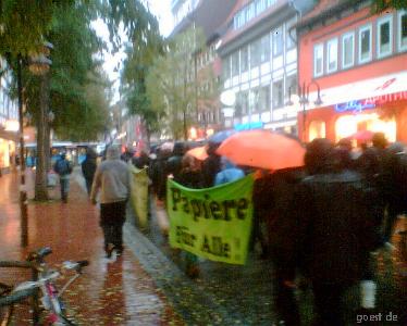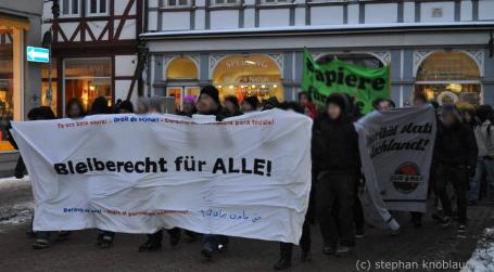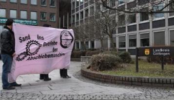 Sead B. ist seit 1999 in Deutschland. Während der gesamten Zeit lebte er im höchst unsicheren Rechtsstatus der Duldung und fiel somit unter die Regelung der sogenannten Residenzpflicht. Das bedeutet, Sead B. war es über den gesamten Zeitraum nicht gestattet, den Landkreis Göttingen ohne Erlaubnis zu verlassen. Darüberhinaus wurde Sead ein Umzug von Duderstadt nach Göttingen, wo er eine Arbeitsstelle im Klinikum hatte, verweigert. Die sogenannte Bleiberechtsregelung kam für ihn nicht in Betracht, dasser drei Mal in zehn Jahren beim Verstoß gegen die Residenzpflicht aufgegriffen und daher als "Straftäter" verurteilt wurde. Zudem verlor er 2009 seine Arbeitsstelle, nachdem er - durch den Zwang bei der weiten Anfahrt zur Arbeitsstelle die öffentlichen Verkehrsmittel zu benutzen - zwei mal verspätet erschienen war. Seither blieb die Bemühung um eine neue Arbeitsstelle trotz unzähliger Bewerbungen ohne Erfolg. ArbeitgeberInnen begründeten ihre Ablehnung mit der Tatsache, dass Sead B. jederzeit abgeschoben werden könne. Überdies sind die Möglichkeiten einer Beschäftigung aufgrund der örtlichen Begrenzung auf den Landkreis Göttingen stark eingeschränkt. Der Vater der Familie, Fadil B., hat bereits einen abgebrochenen Abschiebeversuch hinter sich: Am 9. Dezember letzten Jahres wurde er zusammen mit einer Tochter zum Frankfurter Flughafen gebracht. Damals konnte der Anwalt der Familie mit einem Eilantrag erreichen, dass die Abschiebung mit Rücksicht auf den Zusammenhalt der Familie zunächst ausgesetzt wurde, dassdie Mutter aus gesundheitlichen Gründen nicht "reise"-fähig war. Nach der Behördenbegleitung am heutigen Freitag verließen die UnterstützerInnen Seads das Landkreisgebäude, nachdem dieser aufgebrochen war, um seinen Rechtsanwalt aufzusuchen. Es formierte sich eine spontane Demonstration gegen Abschiebung und für ein bedingungsloses Bleiberecht für alle. Etwa 50 TeilnehmerInnen schlossen sich dem lautstarken Protestzug in die Innenstadt an. (...)"