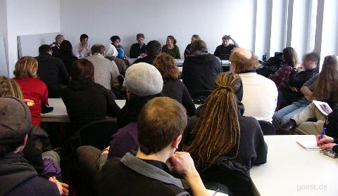 AK Asyl u.a. : Pressekonferenz zu den Abschiebungen von Roma in den Kosovo 5.2.10 Vertreter/innen des Ak Asyl Göttingen e.V., Projekt Roma Center e.V., Bündnis gegen Abschiebung und Rassismus, Niedersächsischen Flüchtlingsrats e.V. und Pastor Lahmann, Migrationsbeauftragter der Ev. Luth. Landeskirche berichten über die aktuelle Situation von Roma in Göttingen und Niedersachsen, ihre schlechten Überlebensmöglichkeiten und die Verfolgung im Kosovo. Von Abschiebung Betroffene berichten über ihre Situation. Konkreter Anlass ist die bevorstehende Abschiebung des 25jährigen Sead Berisha in den Kosovo. Seine Duldung wurde am 29.01.2010 nicht mehr verlängert, die Abschiebung wurde eingeleitet. Der Rest seiner hier lebenden Familie ist ebenfalls von Abschiebung bedroht. Er, seine Eltern und Geschwister sind vor mehr als 10 Jahren aus dem Kosovo in die BRD geflohen: Eine Flucht, nicht nur vor den fürchterlichen Folgen eines Krieges, der mit deutscher Beteiligung geführt wurde, sondern auch vor antiziganistischen Übergriffen durch die Mehrheitsbevölkerung. Seine Geschichte, wie die von vielen, ist die Geschichte einer Odyssee durch den bundesdeutschen diskriminierenden Behördendschungel. Sie zeigt die Unmöglichkeit für die meisten, trotz permanenter Versuche, ein Bleiberecht zu bekommen. (Die Veranstaltung fand im DGB-Veranstaltungsraum 5. OG Weender Landstraße 6 statt)