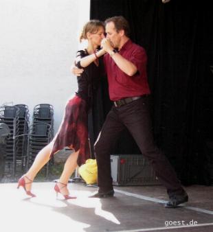 Dieses Bild oben scheint unspektakulär. Aber wer den Tango kennt, der weiß, dass in diesem Bild etwas wichtiges zum Ausdruck kommt. Das Paar steht hier vor Beginn seiner Tanzdarbietung gegenüber; die Tänzerin (Katja) drückt mit ihrer ganzen Haltung die Offenheit für den Dialog aus der im Tango Argentino enthalten ist - "Tango - getanzter Dialog" war auch der Titel der Darbietung von Katja & Klaus.