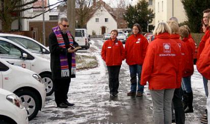 Ambulanter Pflegedienst der Caritas Sozialstation Göttingen / "Der CV ist die vom Bischof in Hildesheim anerkannte institutionelle Zusammenfassung und Vertretung der katholischen Caritas in Stadt und Landkreis Göttingen. Er ist caritativer Sozialdienst der katholischen Kirche, Verband der freien Wohlfahrtpflege ....." (Homepage) 13.12.12 / Anlässlich der Anschaffung von fünf Dienstwagen für den ambulanten Pflegedienst teilt der Caritasverband Göttingen mit, die Caritas Sozialstation Göttingen-Gleichen habe "jetzt 15 Dienstwagen für 160 Patienten und 32 Mitarbeiter. Damit hat das Team für jede Tour einen eigenen Dienstwagen zur Verfügung." Die Autos sind für die Mitarbeiter zuverlässige Partner im Dienst und gleichzeitig Büro und Aufbewahrungsort für Akten, Medikamente und Hilfsmittel. Caritasvorstand Bertil Holst und Pflegedienstleiterin Christiane Koch übergaben den Pflegekräften die Autoschlüssel und "eine Plakette mit dem Bild des heiligen Christophorus." Dass die Dienstwagen von Dechant Wigbert Schwarze "gesegnet" wurden, damit die Mitarbeiterinnen "mit dem Segen Gottes" unterwegs sind, wirkt etwas antiquiert.