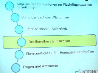 Kritik an den Infoveranstaltungen zu den Flüchtlingsunterkünften Infoveranstaltungen laufen stets nach demselben Schema in allen Stadtteilen ab Hauptziel ist, die Planungen rundum als alternativlos darzustellen und die Bereitschaft zur Übernahme von freiwilliger Arbeit unter der Anleitung der Stadtverwaltung und der Betreiberorganisationen von Flüchtlingsunterkünften zu fördern.