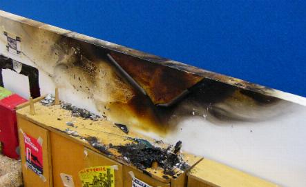 gegen FDP-Politiker wegen Feuerlegens Das Bild unten zeigt die Detailaufnahme eines Ausstellungsobjektes in das brennendes Papier hineingeworfen wurde, das Feuer konnte rechtzeitig gelöscht werden. Der Gutachter behauptete,
