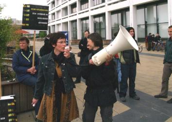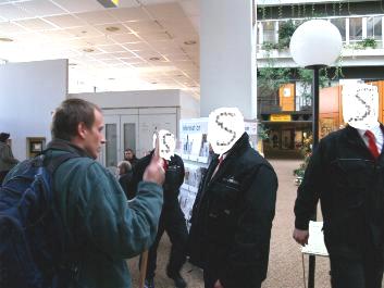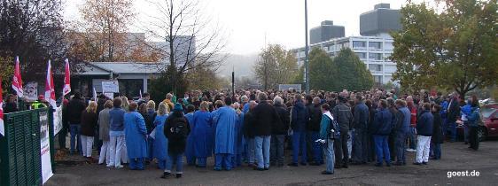 28.10.08 / Die Klinik plant eine "Auslagerung", ein "Outsourcing" der Gastronomiebereiche Kantine, Caféteria usw. . D.h. die Beschäftigten machen ungefähr das gleiche wie bisher, aber sie bekommen einen neuen Arbeitgeber, nämlich die Gastronomie GmbH, die aber gleichzeitig der bisherige Arbeitgeber ist, denn die Gastronomie GmbH gehört zu 100 % der Klinik. Aber - und das ist der Grund für dat janze - sie fällt absurderweise nicht mehr in den Tarifbereich der Klinik und dadurch können die Löhne/Gehälter gekürzt werden. Gegen diese üble Trickserei, die der "Stiftungsausschuß" der Uni auf einer Sitzung am 28.10.08 beschließen wollte kam eine überraschend große Zahl von Kliniksbeschäftigten, die ihren Unmut über diese "Privatisierungsmaßnahme" vor dem geplanten Ort des Treffens äußerten.