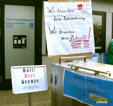 Z.B. fand schon am 23.4.2009 ein Protestmarsch statt gegen die Auslagerung von Reinigungs- und Gastronomiebeschäftigten in die Hände von Privatfirmen mit schlechteren Arbeitsbedingungen und schlechterer Bezahlung. Beim Gang durch die Göttinger Innenstadt beteiligten sich a. 100 Personen. Ziel war das Büro von Uni-Präsidenten Kurt von Figura am Wilhelmsplatz. Nach einer Protestkundgebung überreichten sie Figura eine Protestnote mit ca. 600 Unterschriften.
