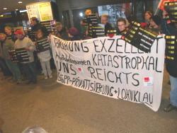 KollegInnen hatten Wärme-Container der Küche herangerollt, viele selbstgemalte Transparente und Schilder sowie Töpfe oder Geschirr mitgebracht. Offensichtlich verschärft sich aber auch die Stimmung in der Auseinandersetzung, denn wo früher die stillschweigende Übereinkunft galt, dass die Pausen für solche Protestaktionen genutzt werden dürfen, wurde nun versucht, Druck auszüben, um eine Teilnahme an der Protestaktion zu verhindern. Konkret wurde mit Abmahnungen gedroht, die nach Auskunft des zuständigen Ver.di-Sekretärs Roth allerdings keine Gültigkeit haben werden.