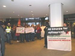 Am 05.12.08 hatten um 15 Uhr die Betroffenen des Uni-Klinikums vor dem Neuen Rathaus zu einer Aktion gegen die Ausgliederung in eine GmbH aufgerufen. Es waren ca. 80 Menschen da, es gab Musik von der Gruppe "Zorn" und Redebeiträge von Patrick Humke-Focks, Gabriela Andretta, Roth von Verdi und Betroffenen.
