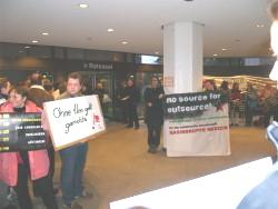 Nur nach einer Einwilligung, die Transparente und Protestschilder nicht mit ins Gebäude zu nehmen, durften die Betroffenen zu der Veranstaltung des Personalrates. Dort wurde die anstehende Kaffee-Pause genutzt, um die Teilnehmer über die Anliegen der Demonstranten zu informieren. Dies wurde auch mit Erfolg getan.