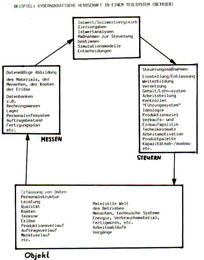 Die Übertragung einer solchen Regelungstechnik auf die Anpassung soziologischer Systeme an vorgegebene SOLLWERTE ist nur soweit möglich, wie geeignete Messmethoden zur Erhebung des ISTWERTES, zentrale Instanzen zum Vergleich von SOLL- und ISTWERT sowie Methoden zur Steuerung gesellschaftlicher Prozesse zur Verfügung stehen. Nach diesem Prinzip funktionierte die Herrschaft zentraler politischer Instanzen seit jeher, aber die Komplexität der soziologischen Systeme, die Komplexität der Zielvorgaben und der Steuerungsmethoden wächst beständig, so dass auch technische Hilfsmittel und komplizierte Organisationsformen für das MESSEN - VERGLEICHEN - STEUERN entwickelt werden müssten, wollte man die Macht der Zentralen erhalten.