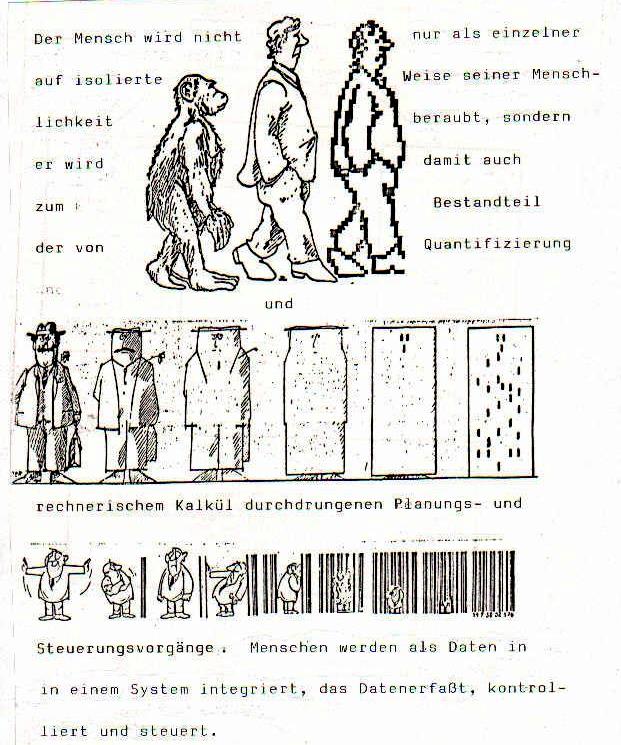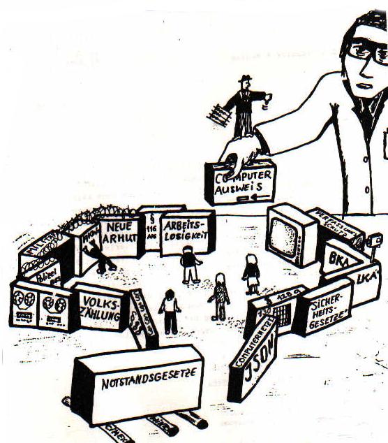 Die Volkszählung ist nur ein Baustein im System von Verdatung, Erfassung, Überwachung und Beherrschung der Bevölkerung. Überall wurden im Zusammenhang mit der Volkszählungsboykottbewegung auch der „maschinenlesbare Personalausweis", die neuen Polizei- und Geheimdienstgesetze („Sicherheitsgesetze“) sowie die Entwicklung der Computertechnik  angesprochen. Wir finden es dringend notwendig auf eine weitgehend im Stillen stattfindende Entwicklung hinzuweisen, die den  angesprochenen Bausteinen des Überwachungsstaates von ihrer Bedeutung her in keiner Weise nachsteht: die Umwandlung des Telefonnetzes mit seinen 27 Millionen Anschlüssen in eincomputerüberwachtes Datennetz, das sogenannte  ISDN
