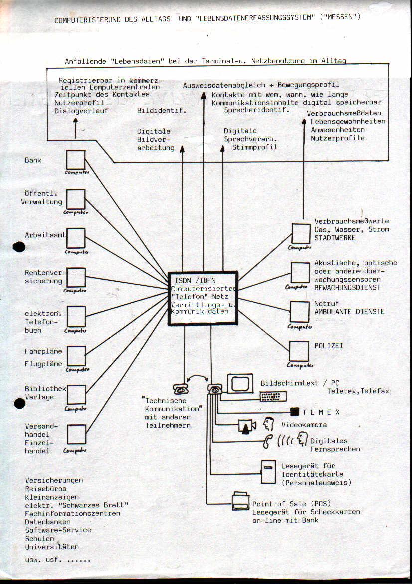 Die Computerisierung des Alltags, wie sie mit der Einführung des BTX-Systems und der Computerisierung des Telefonnetzes beabsichtigt sind, führt zu einem qualitativen Sprung in der Möglichkeit individuelle Ereignisse und soziale Prozesse am Punkt ihrer Entstehung bereits datenmäßig zu erfassen. Mit dem Hometerminal am ISDN-Telefonanschluss in der Wohnung  verbreiten sich die „Datensaugnäpfe eines „Lebensdatenerfassungssystems" im Privatbereich. Gerade die Verbindung von Computernetzen und maschinenlesbaren Identitätskarten (Lesegerät im Terminal integriert und Identifikation Voraussetzung für die Terminalbenutzung) ergibt perfekte Systeme der Erfassung von Alltagsdaten.