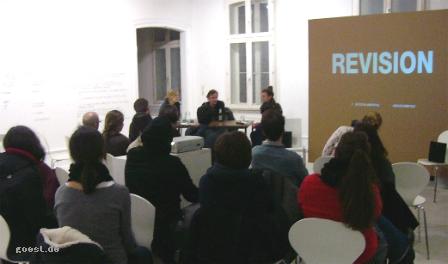 Das Wechseln zwischen dem vom Filmen her gewohnten Denken und den Schreiben am Buch begleitet ihre Darstellungen. Den Text entwickelt sie um die Inseln der vorgestellten Plätze, der Rest ist "dann so etwas wie Weben oder Häkeln". Sie will ihr Vorhaben unterschieden wissen von den Mustern der TV-Tatort-Krimis. Dazu meinte sie: Da passiert zunächst die Tat, dann kommt der Kommissar, regelt das und dann ist am Ende alles wieder in Ordnung. Das geht nur, weil der Fall darin als etwas Privates abgehandelt wird. Sie aber wollte die unauflösbare Eingebundenheit des Falles ins gesellschaftliche System zeigen und sagt "Ich wollte Unruhe schaffen, die bleibt." Mit dem Ariadneverlag hat sie für das Thema einen passenden Verlag gefunden. Der Verlag betreut eine eigene Sparte zu "Migration, Menschenrechten und Flucht" und ihrer Verlegerin Else Laudan ist in deren >>Kommentar zum Buch das emotionale Engagement für Krögers Roman anzumerken. Film "Revision" Am Mittwoch den 20.3.13, 20 Uhr wurde im Künstlerhaus, in den Ausstellungsräumen der Veranstaltungsreihe Movements of Migration der Film "Revision" gezeigt und mit Regisseur Philip Scheffner aus Berlin diskutiert. Einen kurzen Eindruck von dem Film kann man sich mit dem >>Trailer verschaffen (Bei Suche Revision eingeben)