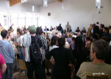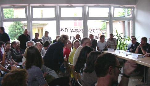 Roma - WohnviertelkonflikteBericht vom "Bürgergespräch" Am 13.8.09 fand im Saal des Gemeindehauses der katholischen St. Godehardgemeinde das "Bürgergespräch" statt zu dem die Stadt die Anwohner eingeladen hatte. Um 17 Uhr war der Saal bereits mit ca. 170 Personen überfüllt. Vor der Glasfront an der Seite wurde von außen ein Transparent "gegen den rassistischen Normalzustand" hochgehalten. An der Tür beschwerte sich schon ein Anwohner, "die (Sozialdezernentin Schlapeit-Beck) hat gesagt, wir wären gar nicht eingeladen, aber wir sind doch Anwohner." An einer langen Tischreihe saßen Vertreter der Polizei und der Stadtverwaltung.